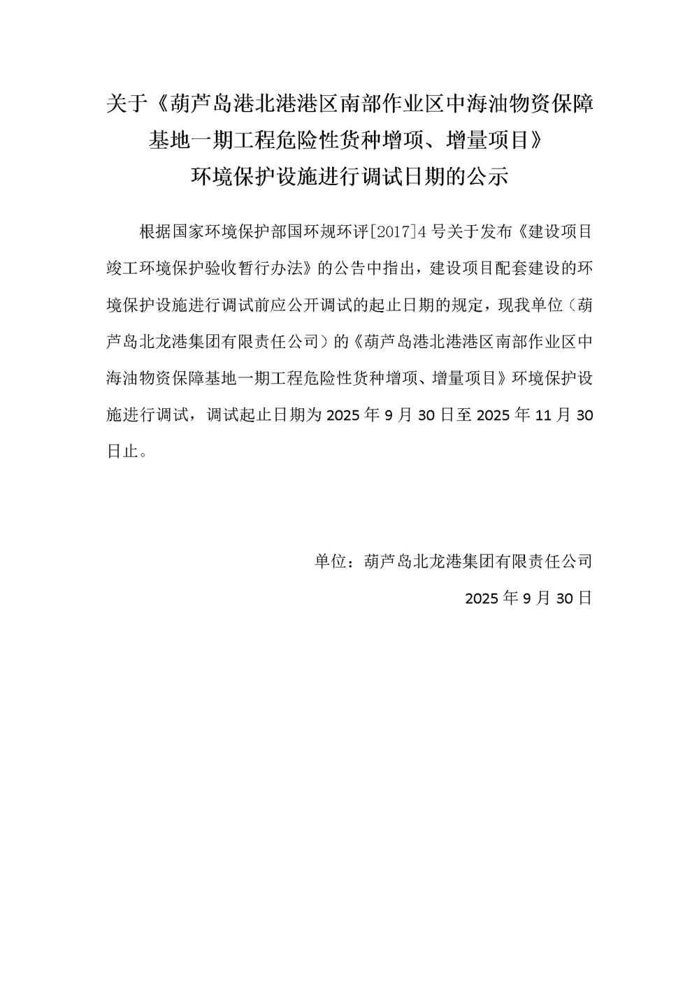 關(guān)于《葫蘆島港北港港區(qū)南部作業(yè)區(qū)中海油物資保障基地一期工程危險(xiǎn)性貨種增項(xiàng)、增量項(xiàng)目》 環(huán)境保護(hù)設(shè)施進(jìn)行調(diào)試日期的公示