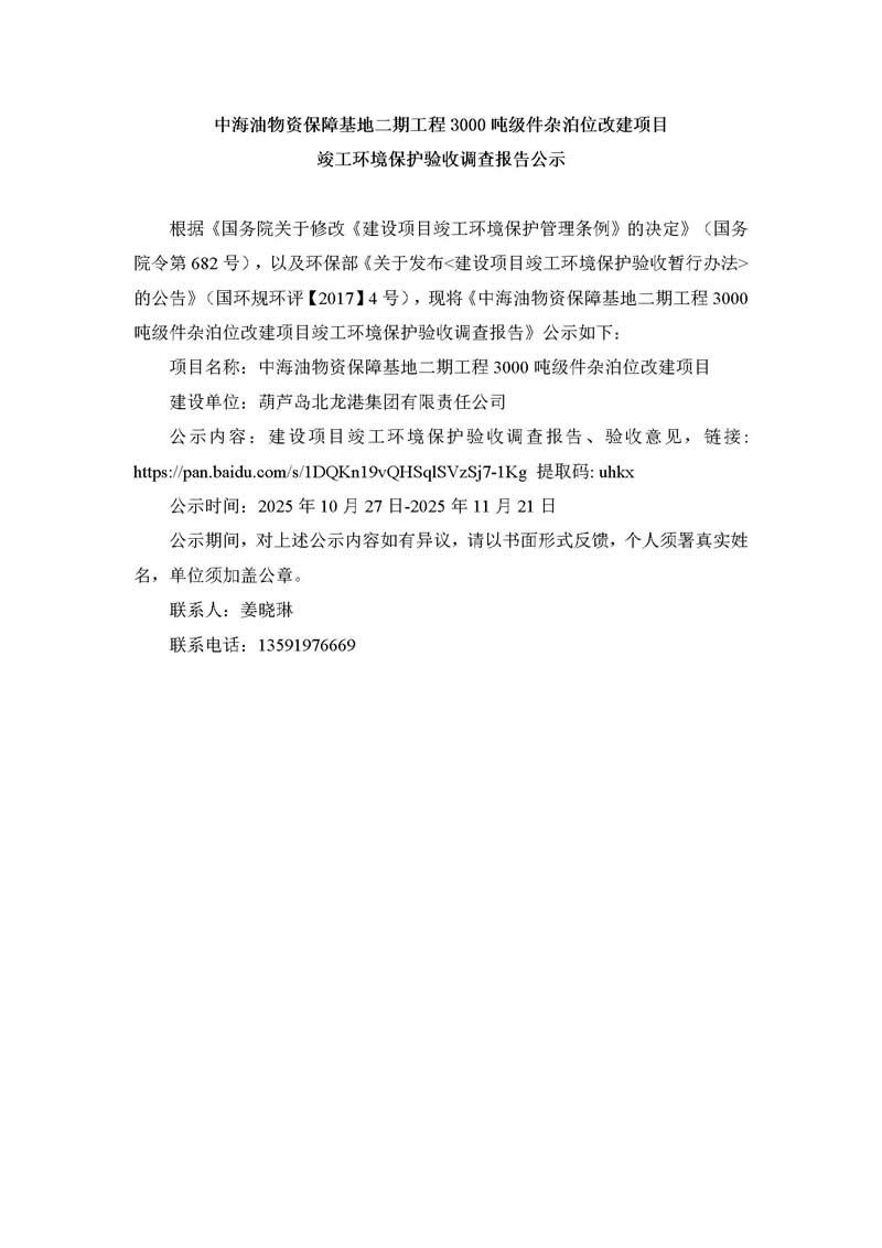 中海油物資保障基地二期工程3000噸級件雜泊位改建項(xiàng)目 竣工環(huán)境保護(hù)驗(yàn)收調(diào)查報(bào)告公示