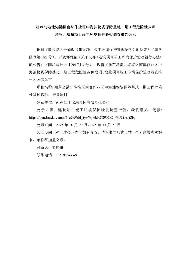 葫蘆島港北港港區(qū)南部作業(yè)區(qū)中海油物資保障基地一期工程危險(xiǎn)性貨種 增項(xiàng)、增量項(xiàng)目竣工環(huán)境保護(hù)驗(yàn)收調(diào)查報(bào)告公示